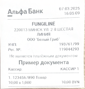 Оплата и доставка 🏬 Самовывоз Адрес: г. Минск, ул. Короля, 2 Время: ежедневно с 16:00 до 20:00 Оплата: наличными или картой на месте 🚗 Курьер по Минску Стоимость: 10 BYN или БЕСПЛАТНО от 200 BYN Сроки: доставка в день заказа или на следующий Оплата: онлайн или курьеру при получении 📦 Европочта / Белпочта (по всей Беларуси) Стоимость: от 5 BYN или БЕСПЛАТНО от 200 BYN Сроки: 2–5 дней (в зависимости от региона) Оплата: онлайн или при получении Оплата 💳 Банковской картой Visa / MasterCard через систему WebPay.by 🧾 Через ЕРИП Оплата через интернет-банк или терминал 💵 При получении Наличными или картой курьеру / в пункте самовывоза Международная доставка 🌍 Доставка осуществляется только по территории Беларуси. Для заказов из других стран: 🇷🇺 Российская Федерация — fungiline.ru промокод BEL5 🇰🇿 Казахстан — fungiline.kz промокод BEL5 🇪🇺 Европа и остальной мир — fungiline.eu промокод BEL10